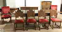 ... -Two matched feudal oak dining room chairs with armrests, and red velvet upholstery on seats and seat back. These measure 43" tall by 25" wide by 26" deep. -Four matched feudal oak dining room chairs, with red velvet upholstered seats and decoratively carved backs. These measure 39" tall by 19" wide by 22" deep. -Large feudal oak dining room table with extendable leaves. Stout, solid oak construction with decoratively carved accents. Measures 30 1/2" tall by 42" wide. 120 1/2" in length with leaves extended, 72" long with leaves nested. -Feudal oak server with cupboard. Measures 32" tall by 41" wide by 19" deep. -Feudal oak sideboard with 3 drawers, and 3 cupboards with adjustable shelves. Measures 35" tall by 67 1/2" wide by 20" deep. -Feudal oak buffet with 4 cupboards, and one large drawer. Measures 55" tall by 40" wide by 19" deep. To inspect and acquire more detailed information about this lot, please attend our live preview before the auction. Condition / Notes: This furniture shows well, with mild to moderate age and wear, such as patina on brass hardware, mild abrasions throughout, mild to moderate surface stains, circular stains, and a sticky cupboard on the server that will not open easily. Mild fading on chair upholstery, and mild soiling. For lots which include only books, our shipping charge applies to any address within the fifty United States. This lot will be available for pickup only.